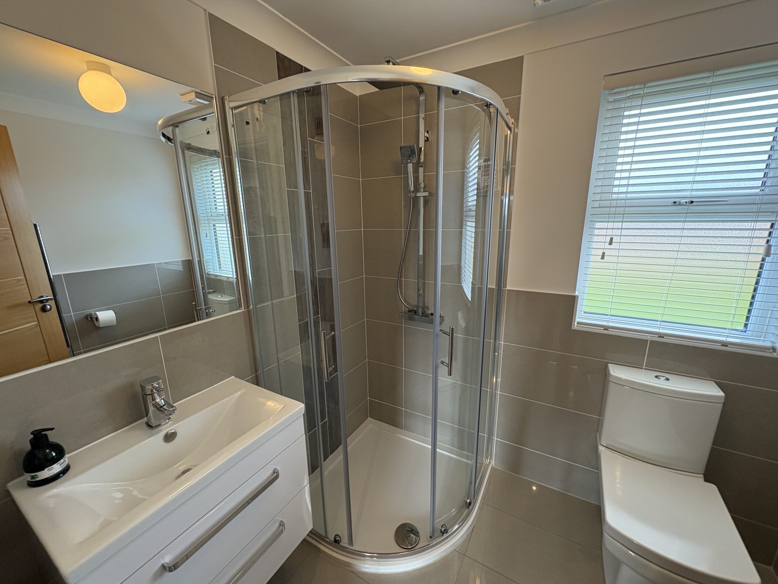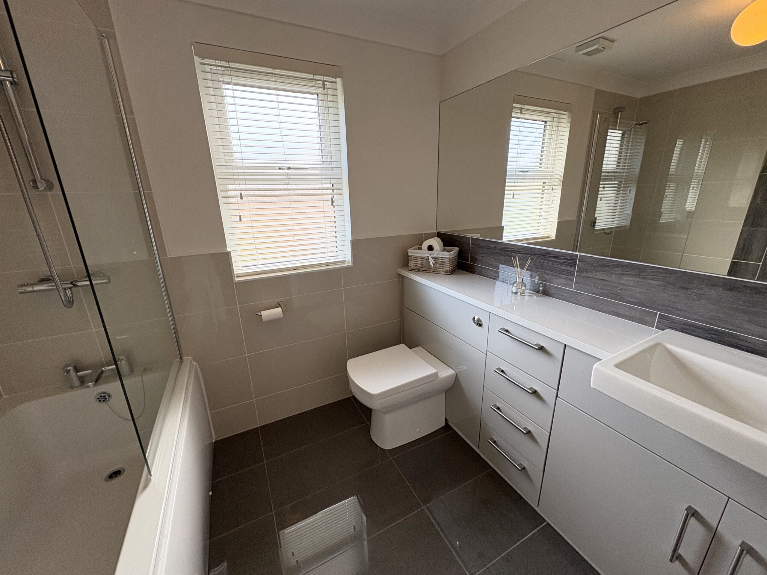 The main bathroom is tiled with vanity sink unit, bath with shower over and heated towel rail.