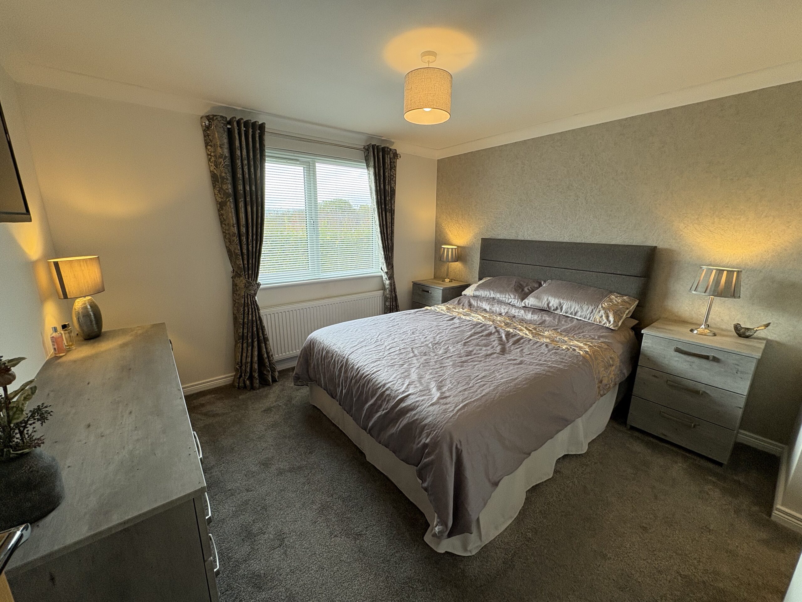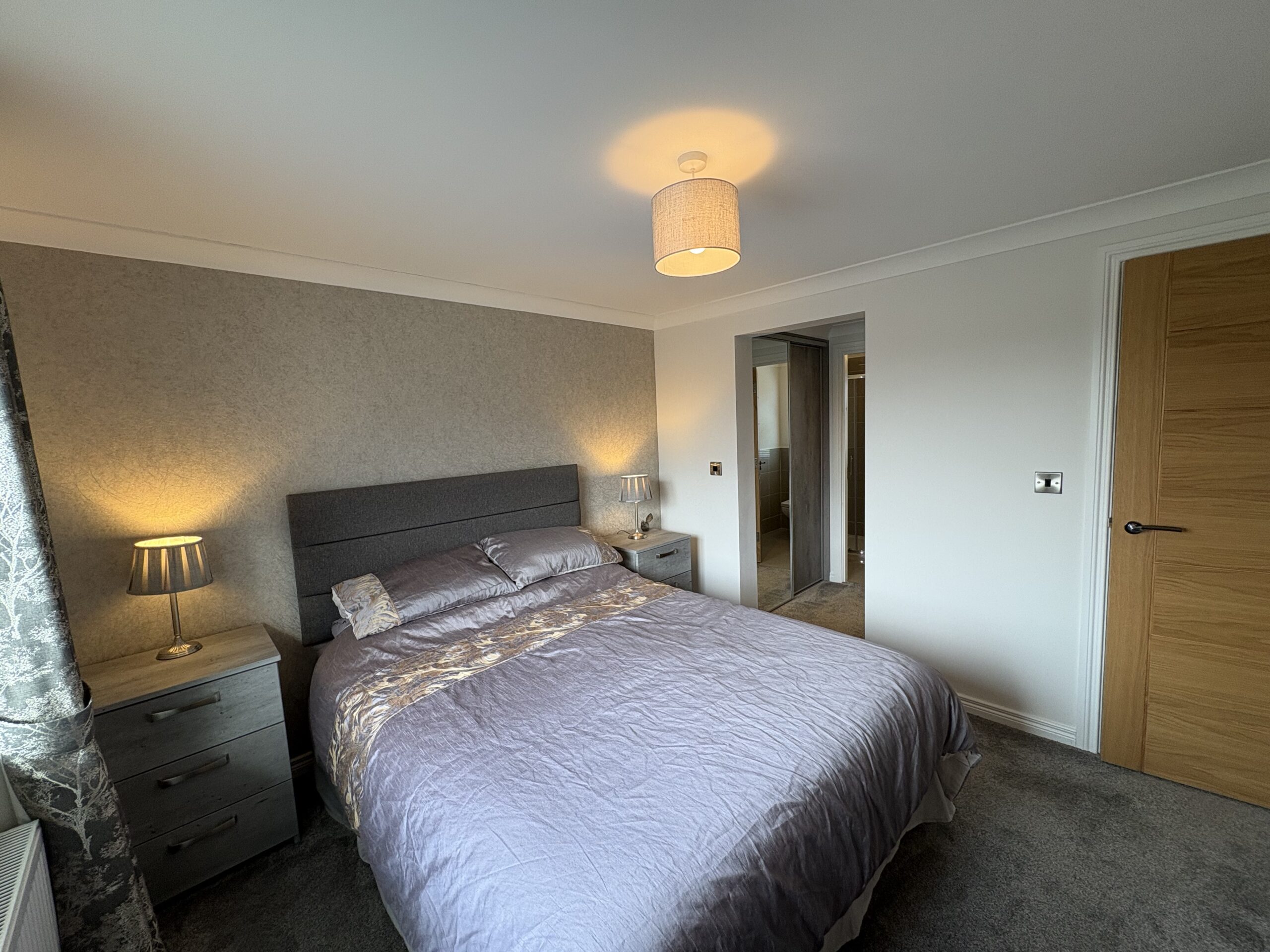 The master bedroom is a good size with dressing table, king size bed, bed side tables, walk through wardrobe and large ensuite with corner shower cubicle.