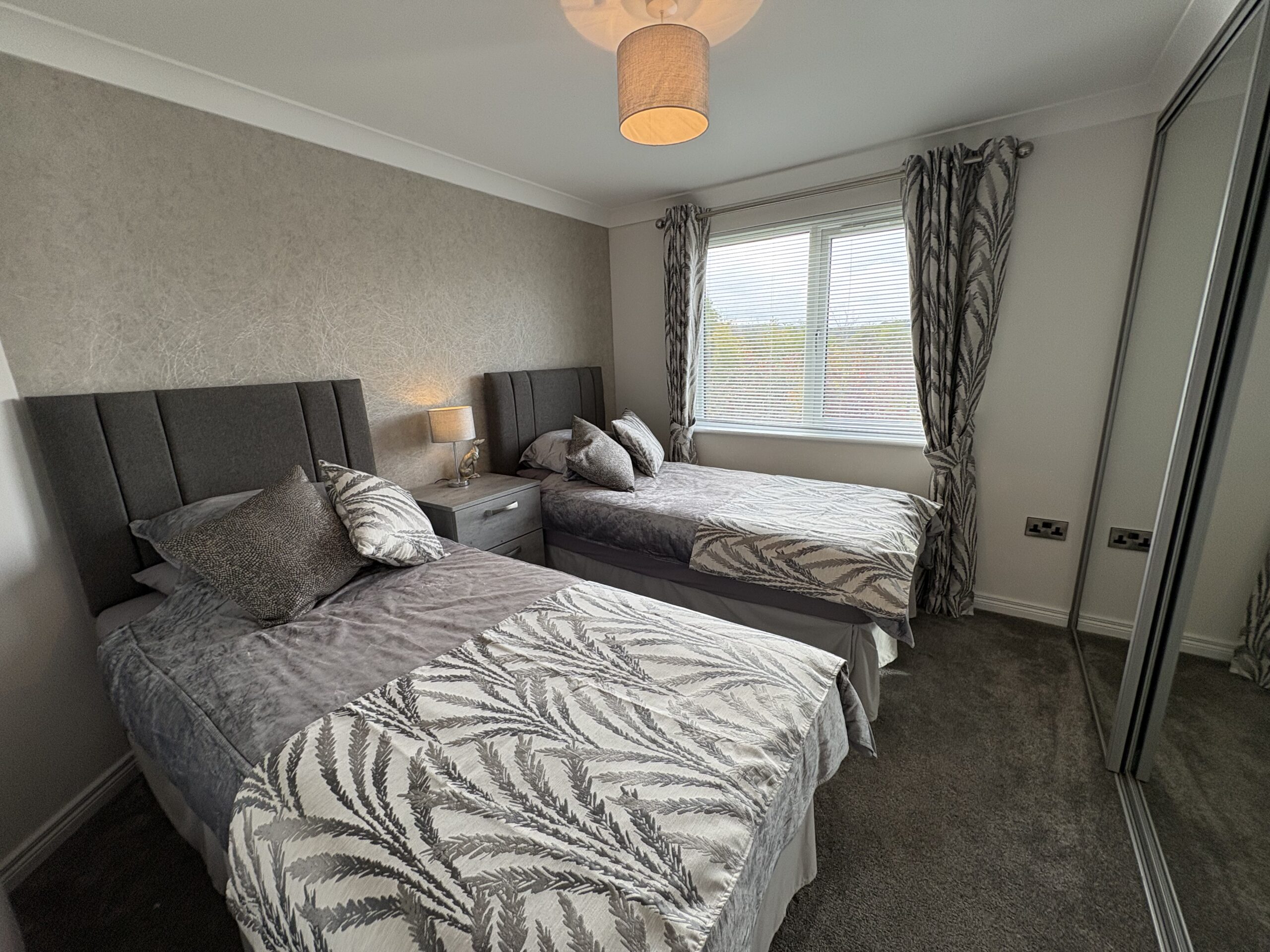 The second bedroom is again of a good size with twin beds, bedside table and sliding wardrobe doors.