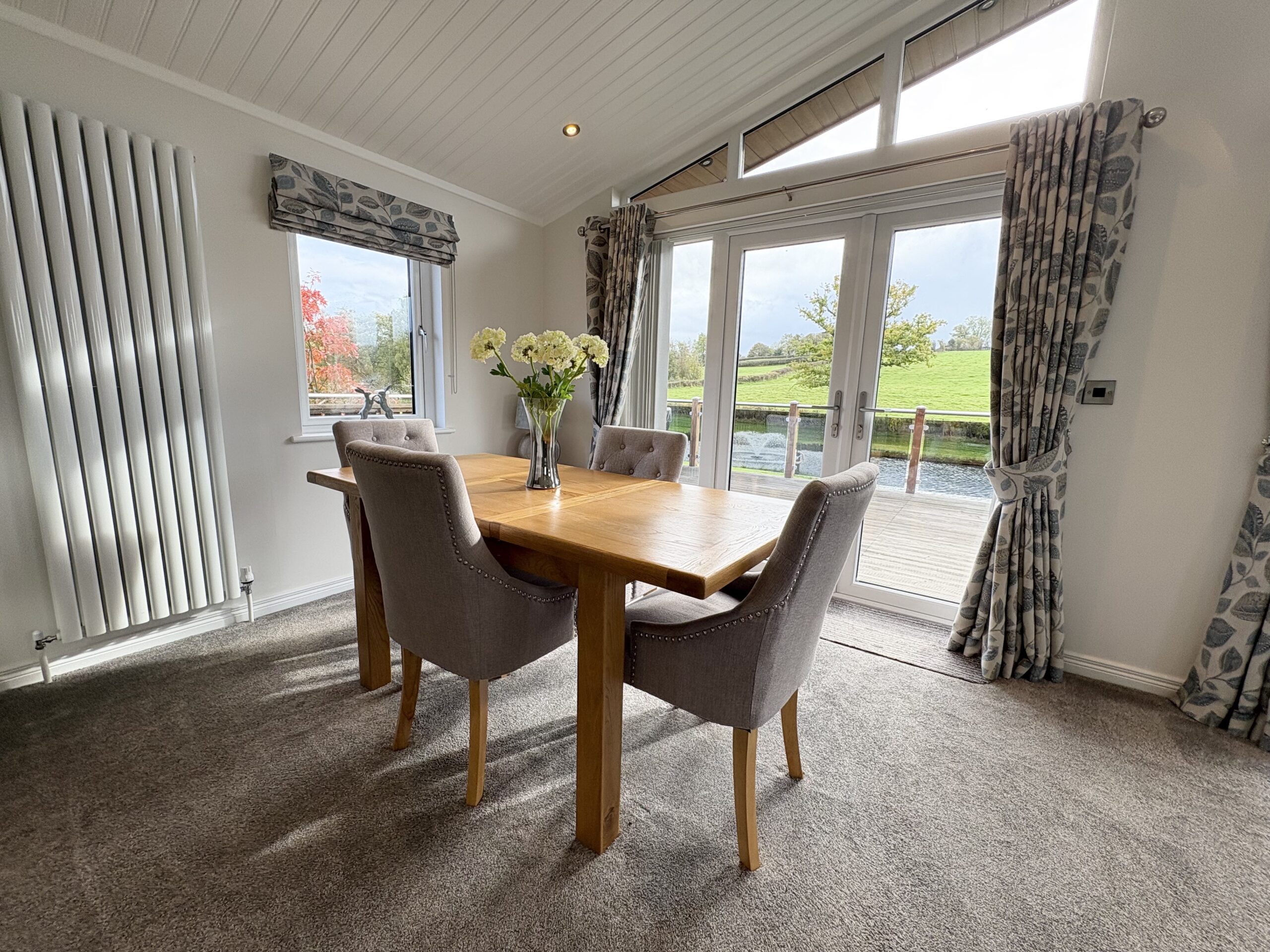 The extendable dining table with 4 padded chairs benefits from lovely views over the lake.