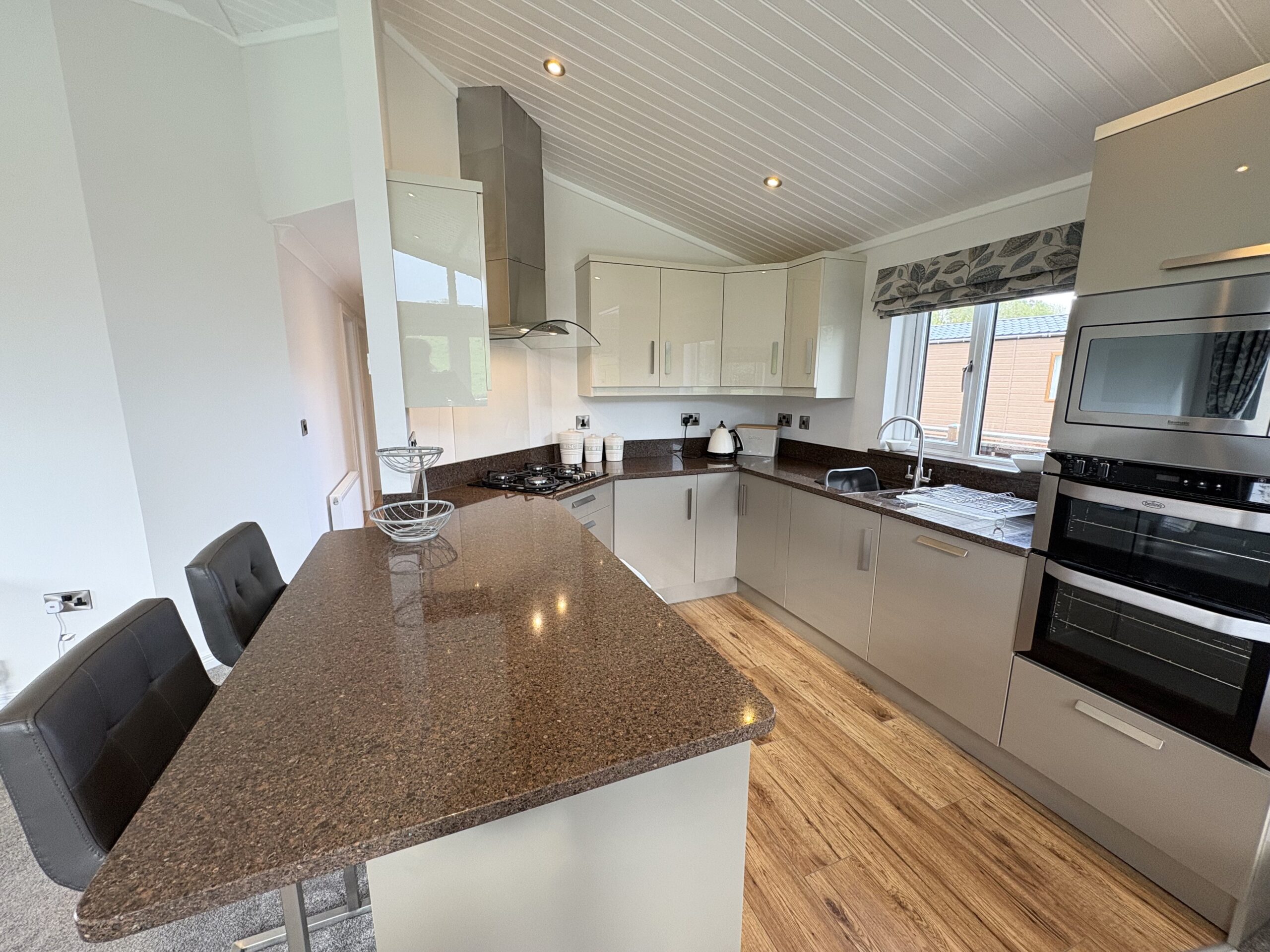 The U-shaped kitchen has granite surfaces, gloss cupboards, integrated dishwasher, double oven, under counter fridge freezer, microwave and gas hob with extractor above. There is also a breakfast bar with two stools to allow for sociable cooking!