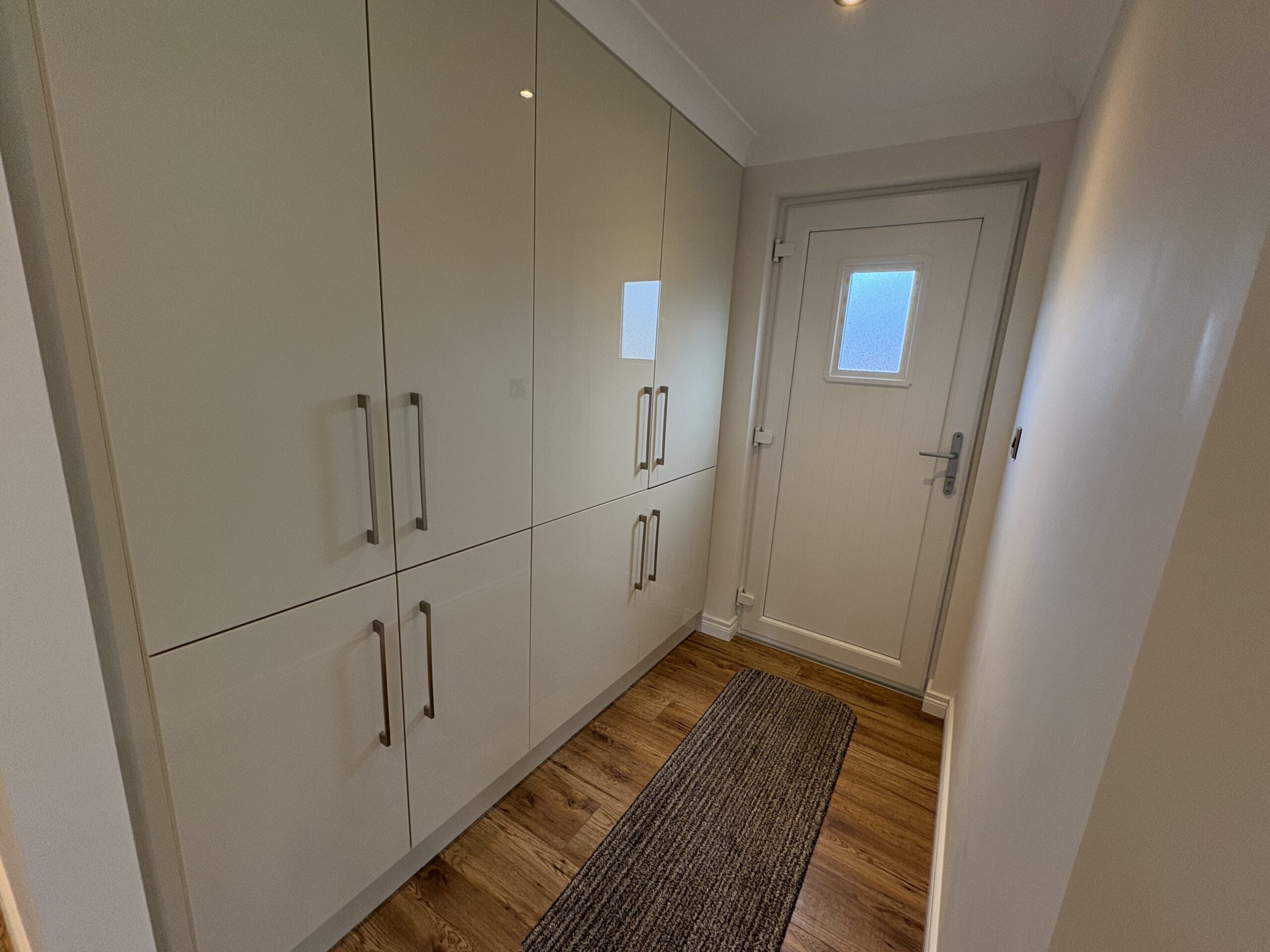 Entering through the side door, there is a useful utility area with gloss cupboards housing lots of storage, washing machine and boiler.