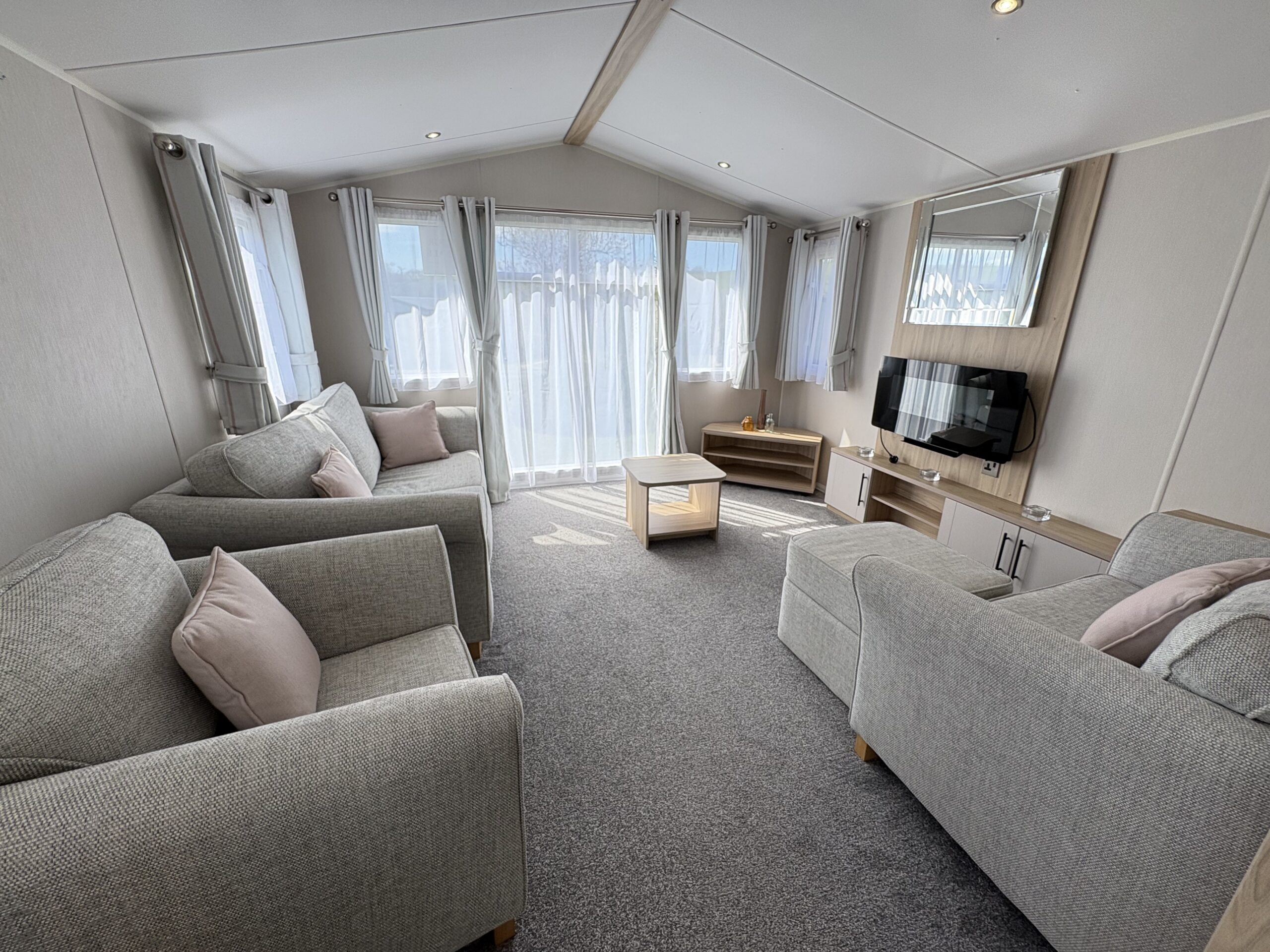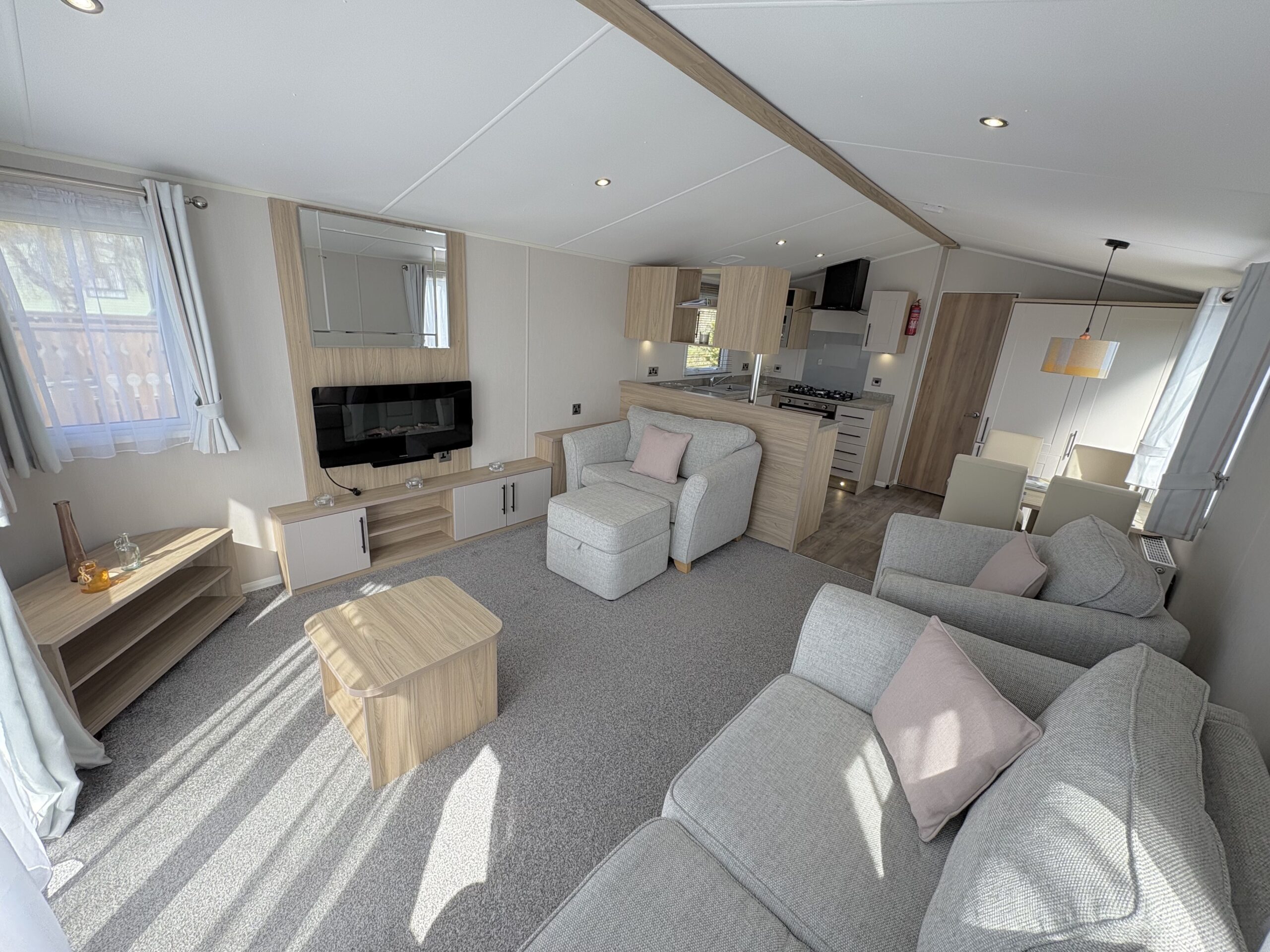 The lounge area has a large sofa (with sofa bed), snuggle chair, another armchair and an ottoman footstool / storage. There is also a modern electric fire, TV unit and coffee table.