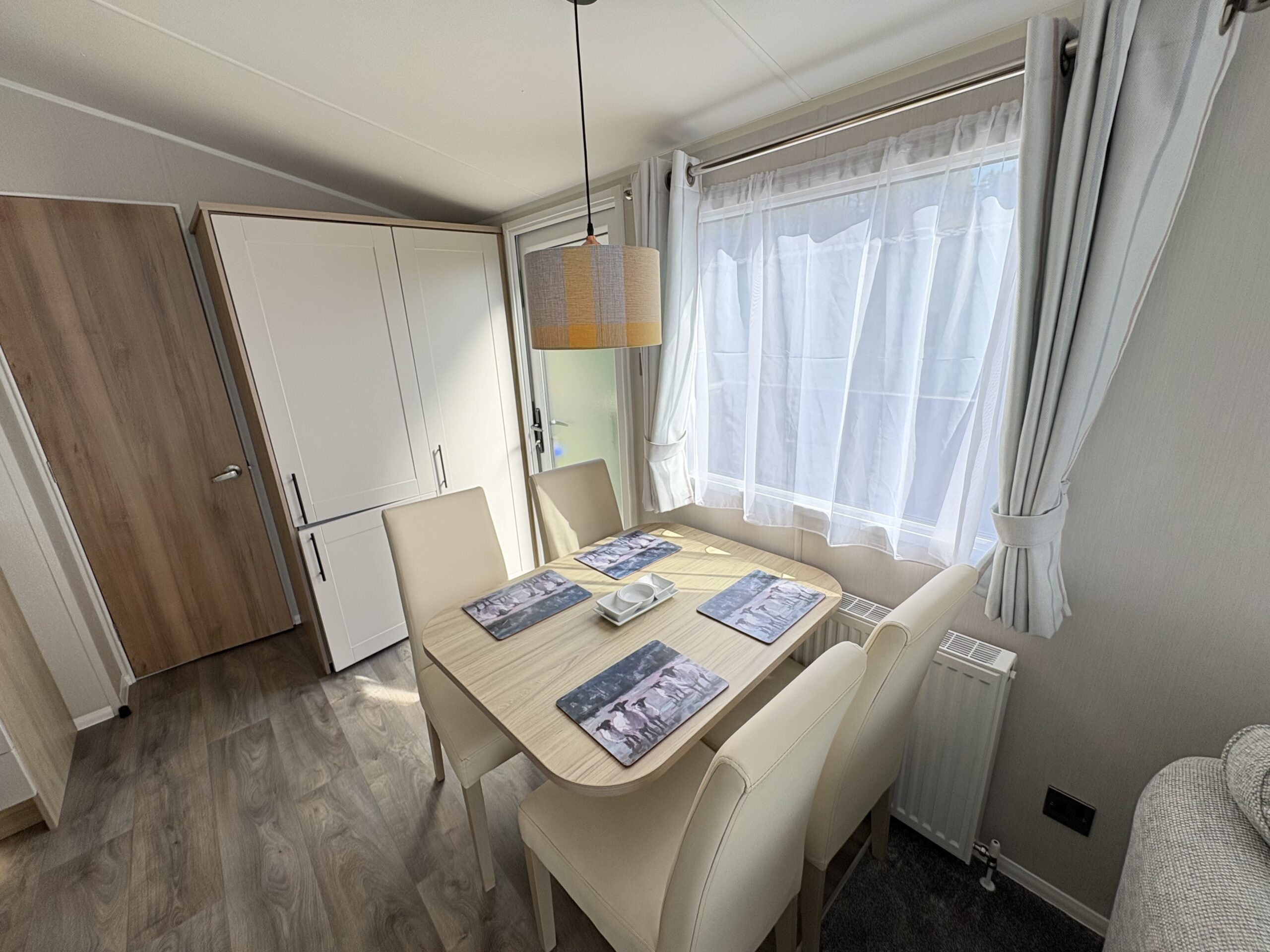 The free standing dining table and chairs offer comfortable dining with lots of natural light.