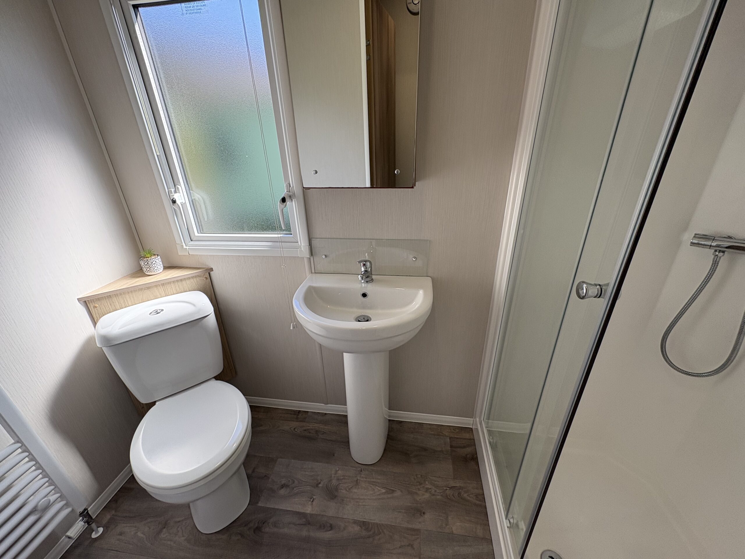 The main bathroom has a large shower cubicle, sink unit and wc.