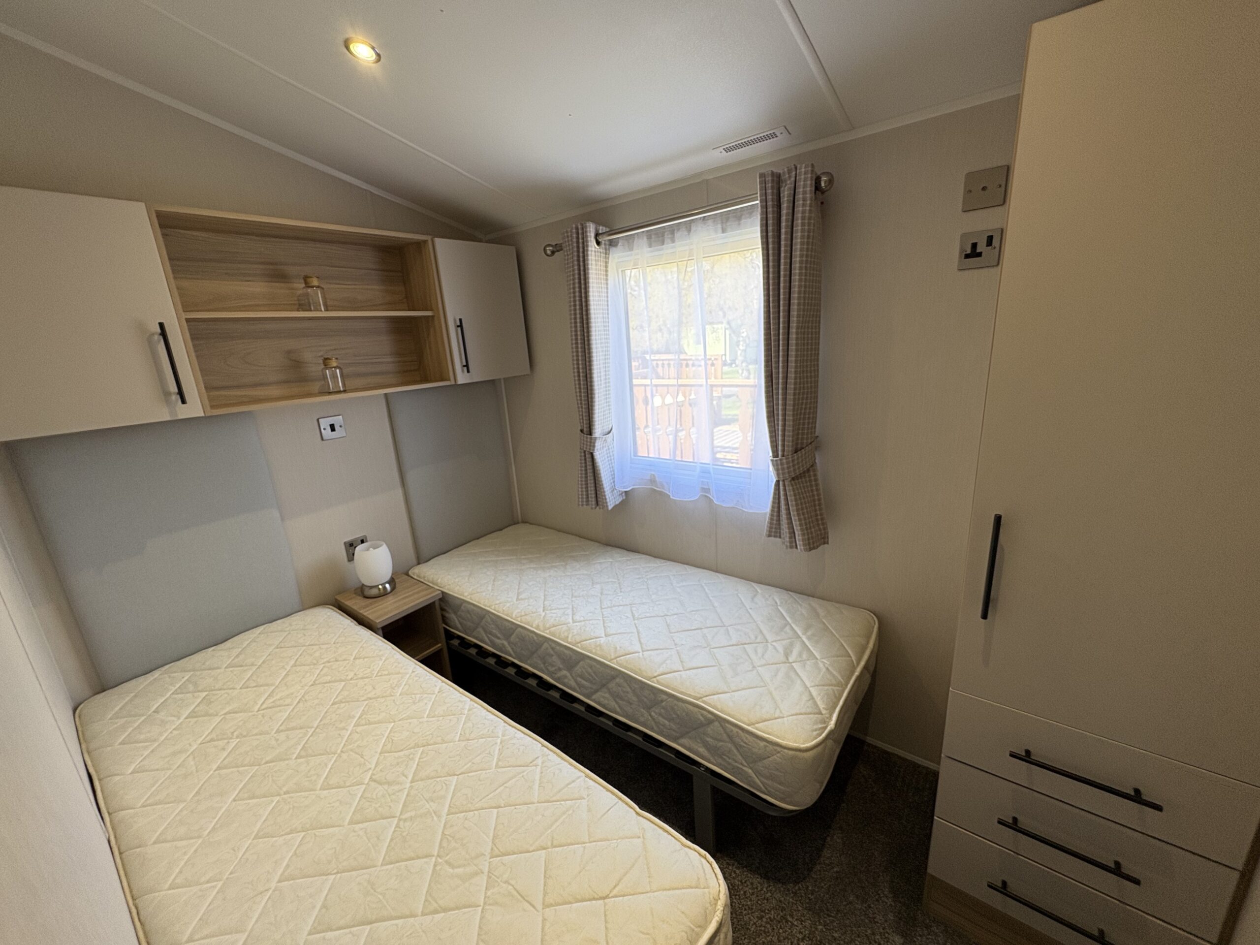 The second bedroom is a good sized twin with overbed storage, bedside table and wardrobe.
