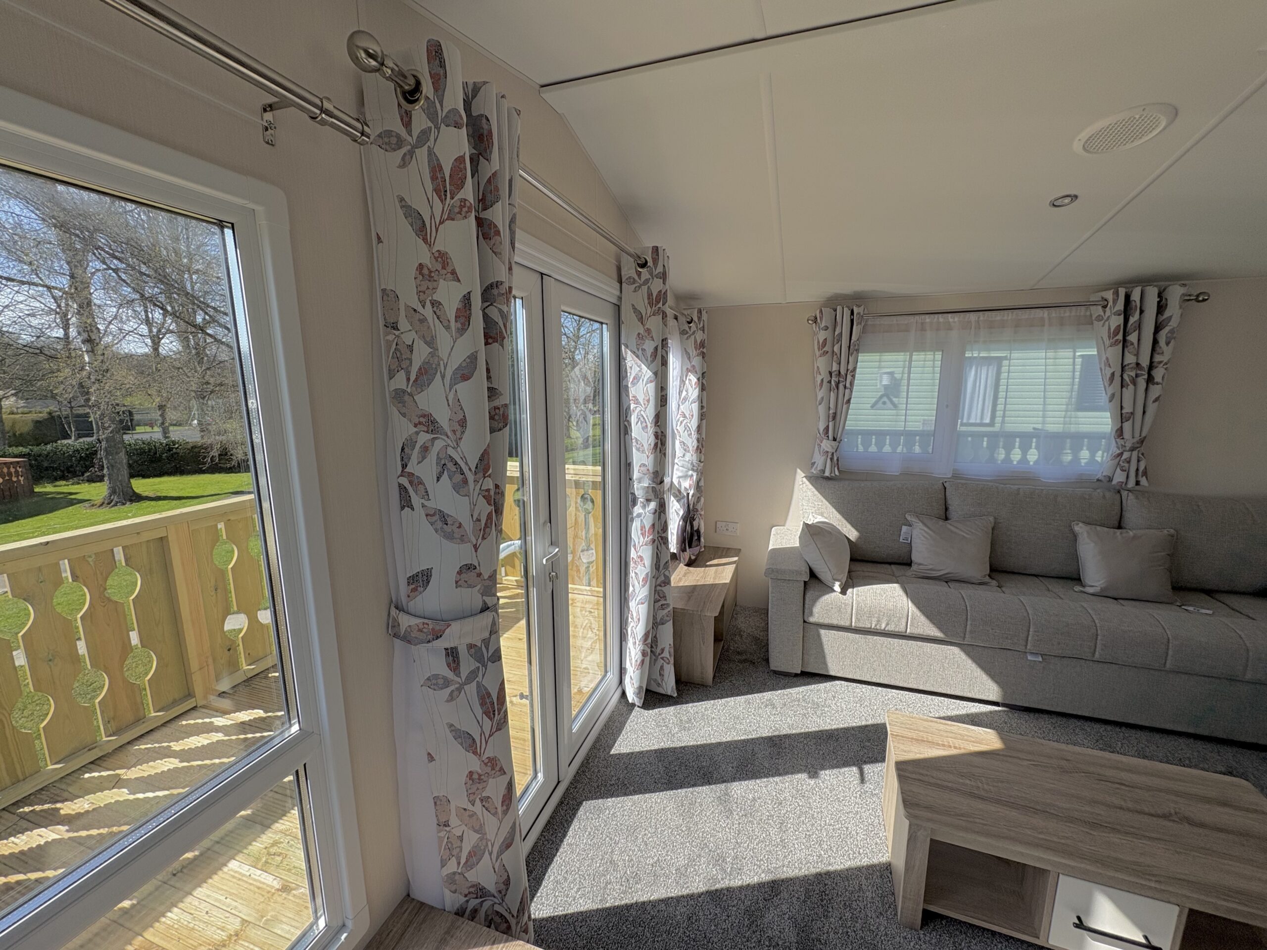 The lounge area has an L-shape sofa, TV unit, coffee table and side unit with sliding French doors opening out on to the south facing decking.