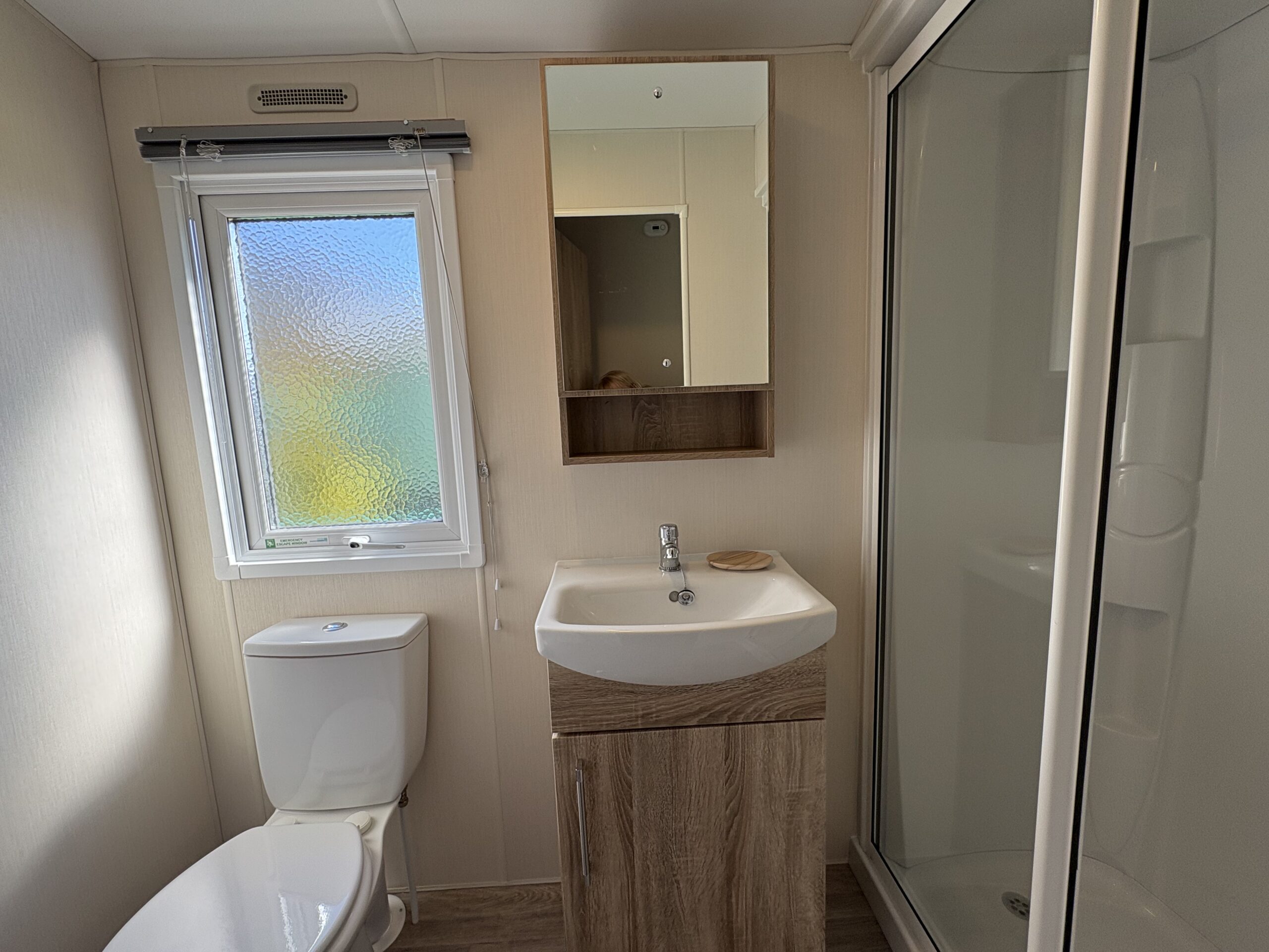 The main bathroom has a large shower cubicle, vanity sink unit and wc.